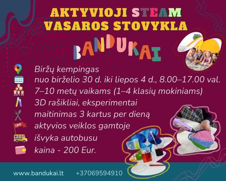 Aktyvioji vasaros STEAM stovykla – tai unikali galimybė vaikams praleisti vasaros dienas gamtoje, išbandyti įvairias aktyvias veiklas ir įgyti naujų įgūdžių. Kiekviena diena kupina nuotykių. Mūsų profesionalūs vadovai pasirūpins, kad kiekvienas vaikas jaustųsi saugiai ir smagiai. Stovykloje vaikai lavins socialinius įgūdžius, mokysis bendradarbiauti, ugdys pasitikėjimą savimi bei kurs nepamirštamus prisiminimus!